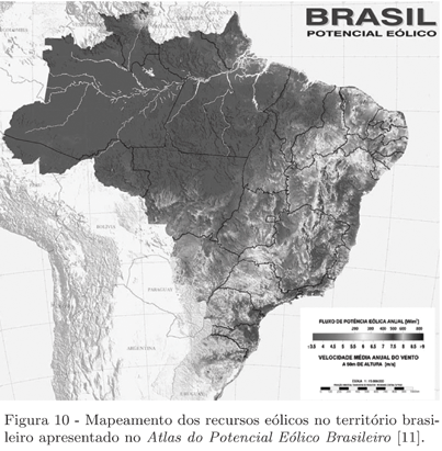 Outro importante resultado de trabalho desenvolvido por pesquisadores brasileiro é o Atlas do Potencial Eólico Brasileiro [11]. As informações do vento geostrófico contidas nesta base de dados foram geradas a partir da simulação da circulação atmosférica de grande escala por um modelo de mesoescala chamado MASS (Mesoscale Atmospheric Simulation System). A partir desses dados de vento geostrófico, foi empregado o refinamento físico com o código WindMap para estimar os dados de vento na altura típica dos aerogeradores (50 m). A Fig. 10 apresenta o mapeamento da média anual do fluxo de potência eólica e da velocidade do vento. Os valores apresentados neste mapeamento foram validados utilizando dados de vento coletados na superfície e o desvio-padrão observado para a diferença entre a velocidade estimada e a velocidade medida foi da ordem de 7,5%. Segundo o Atlas do Potencial Eólico Brasileiro, mais de 71.000 km2 do território nacional possui velocidades de vento superior a 7 m/s ao nível de 50 m, o que propicia um potencial eólico da ordem de 272 TWh/ano de energia elétrica. Essa é uma cifra bastante significativa considerando que o consumo nacional de energia elétrica é de 424 TWh/ano. A maior parte desse potencial está na costa dos estados nordestinos, como conseqüência dos ventos alísios.