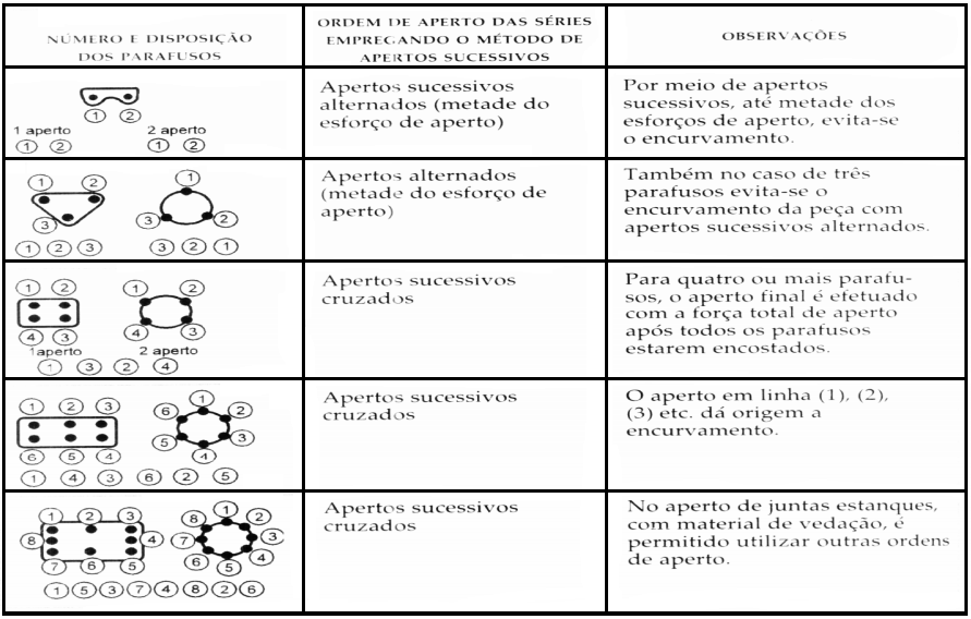 É importante obedecer à orientação da tabela para que o aperto dos elementos de fixação seja adequado ao esforço a que eles podem ser submetidos. Um aperto além do limite pode causar deformação e desalinhamento no conjunto de peças.