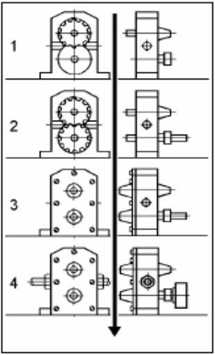 A montagem peça a peça é efetuada sobre bancadas. Como exemplo, a figura mostra a seqüência de operações a serem realizadas para a montagem de uma bomba de engrenagens.