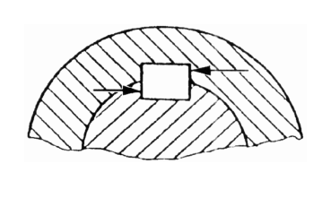 Quando ocorre mudança brusca de seção em uma peça, os efeitos são praticamente iguais aos provocados por cantos vivos. Por outro lado, se os cantos forem excessivamente suaves, um único caso é prejudicial. Trata-se do caso do excesso de raio de uma peça em contato com outra. Por exemplo, na figura abaixo, a tensão provocada pelo canto de um eixo rolante, com excesso de raio, dará início a uma trinca que se propagará em toda sua volta.
