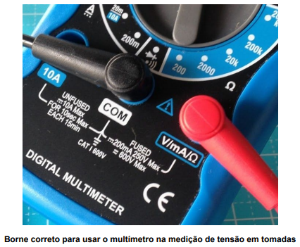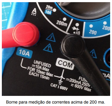 Muito cuidado ao realizar este tipo de medição, primeiro verifique se as pontas de prova do multímetro se encontram conectadas nos bornes corretos, como na foto abaixo.