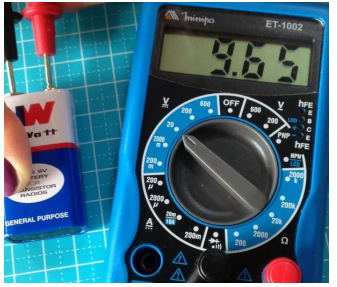 Tensão contínua é a tensão de pilhas, baterias e fontes de alimentação cc. Compare o valor medindo com os valores nominais destas fontes de alimentação para saber se estão ok, como na imagem abaixo, onde realizamos a medição em uma fonte de 9v.