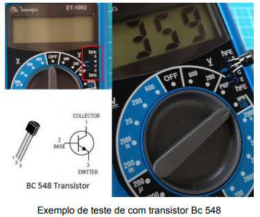 Agora é só encaixar na posição correta base, coletor e emissor e selecionar a escala hfe, ela irá mostrar o valor correspondente ao ganho do transistor. Compare este valor medido com o datasheet se estiver aproximado significa que o transistor está ok.