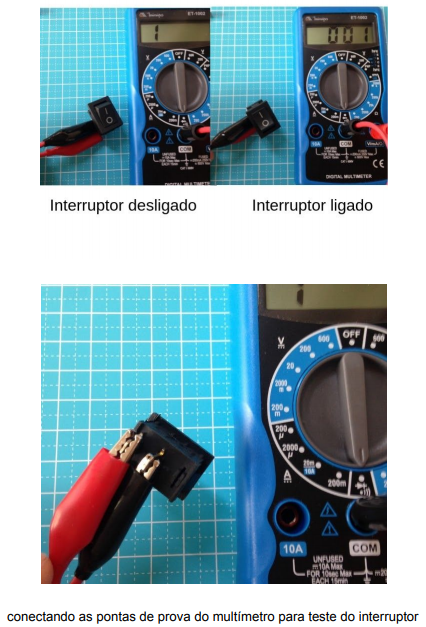 Um interruptor em bom estado vai sempre permitir passagem de corrente elétrica na posição de ligado e a não permitir na posição de desligado, e, para testar vamos usar a escala de teste de continuidade (do bip) e vamos posicionar as pontas de prova do multímetro nos terminais do interruptor.