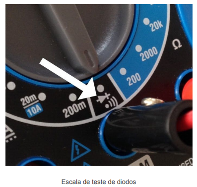 Para realizar testes em diodos com o multímetro vamos selecionar a escala de teste de diodos que o símbolo é exatamente o símbolo do diodo.