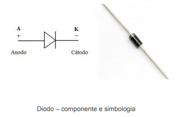 O diodo é composto por 2 terminais o anodo e o catodo, o lado do catodo é o lado onde se encontra a faixa, veja na foto abaixo o símbolo e a imagem do componente.