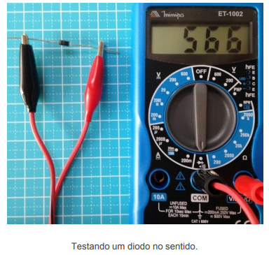 Com o multímetro já na escala de teste de diodo vamos conectar a ponta de prova vermelha do multímetro (positivo) no terminal anodo do diodo e a ponta de prova preta (negativa) do multímetro no terminal catodo do diodo. Com isso o (caso o diodo esteja em bom estado) multímetro irá mostrar uma tensão 0,4 V normalmente, mas pode variar um pouco, se estiver aberto não irá indicar o número 1 do lado esquerdo (o display não se altera) e se estiver em curto o display irá mostrar 0,00. No caso o nosso multímetro a tensão é mostrada em milivolts veja na foto abaixo.