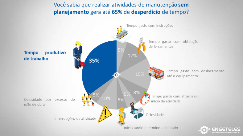 Quando se pratica uma atividade que não é planejada,65% do tempo é desperdiçado. Então, nas oito horas normais de trabalho,aproveitamos apenas 2,8 horas,é um número assustador e a razão disso é explicada no infográfico a seguir: