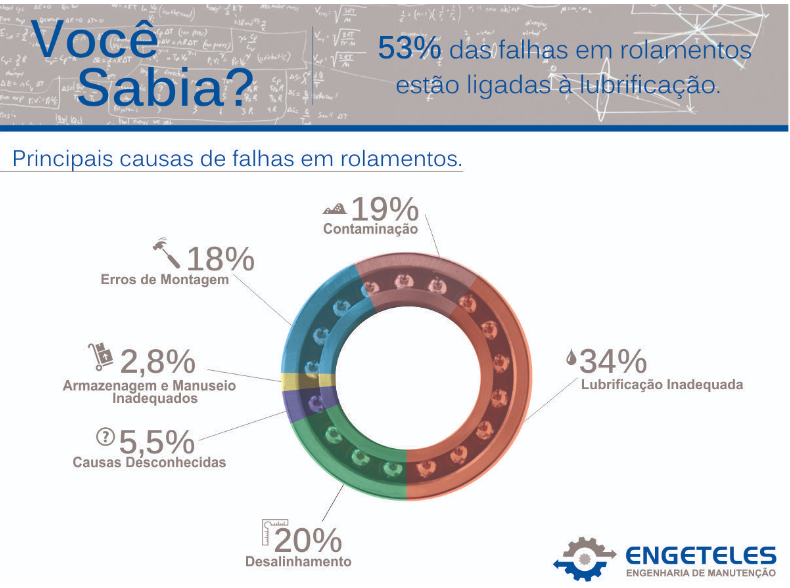 Conforme mostra o gráfico abaixo. A cada 10 falhas de rolamentos, 5 foram causadas por falhas de lubrificação. Por isso é dever do PCM que todos os equipamentos da fábrica sejam lubrificados da forma correta, na frequência correta e com o lubrificante correto.