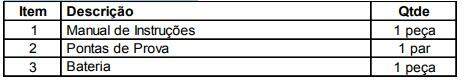 - Segurança / Conformidade: IEC1010 Sobretensão e Dupla Isolação, CAT I 600V.