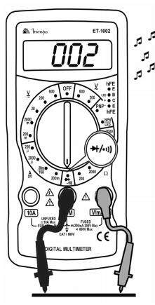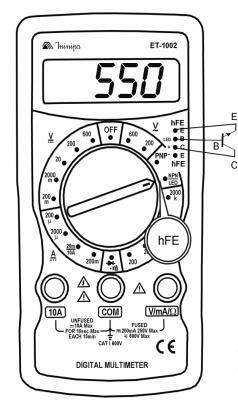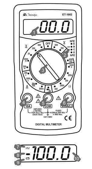 O multímetro digital Modelo ET-1002 (daqui em diante referido apenas como instrumento) diferencia-se pelo display de 3 1/2 dígitos e pelas medidas de tensão DC / AC, corrente DC, resistência, ganho de transistores (hFE) e pelos testes de diodo e continuidade.
