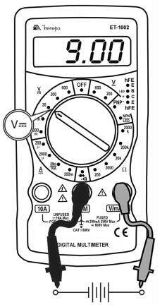 Posicione a chave rotativa em uma das faixas V= (200mV, 2000mV, 20V, 200V ou 600V).