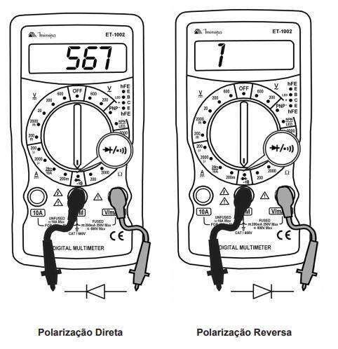 Utilize o teste de diodo para testar não só diodos, mas também transistores e outros dispositivos semicondutores. O teste de diodo envia uma corrente através da junção do semicondutor, e então mede a queda de tensão sobre a junção. Uma junção de silício boa fornece uma queda de 0.5V a 0.8V.