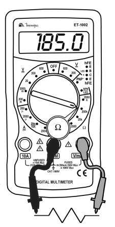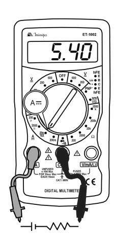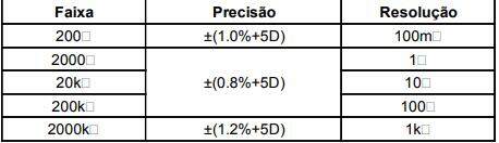 - Na faixa de 200Ω, curto circuite as pontas de prova, e o valor mostrado deve ser subtraído das leituras das medidas para maior precisão.
