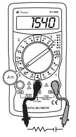 Posicione a chave rotativa em uma das faixas A= (200µA, 2000µA, 20mA, 200mA ou 10A). Lembre-se que para medida na faixa 10A, deve-se usar a entrada de 10A.