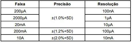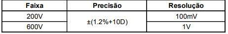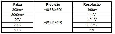 Precisão: ± (a% leitura + b dígitos), garantido por 1 ano. Temperatura de operação: 23°C ± 5°C. Umidade relativa: < 75%. As precisões são especificadas de 5% a 100% da faixa ou especificado de outra maneira.