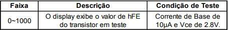 Para evitar danos ao instrumento, não conecte nenhuma tensão aos terminais de entrada do instrumento e do soquete de teste, quando estiver medindo hFE de transistor.