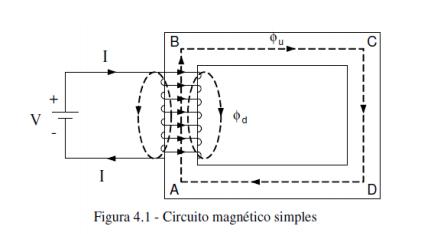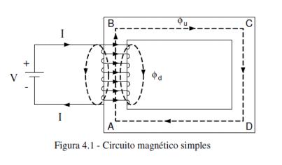 Considere-se que no circuito magnético da figura 4.1 seja possível inserir um gaussímetro para medir a indução no núcleo. Aumentando-se a tensão aplicada na bobina, que produz um aumento de corrente, o gaussímetro mostra um crescimento na indução magnética. Portanto, a indução depende da corrente que circula pela bobina.