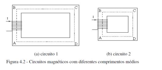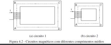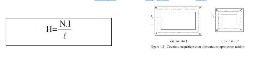 Exemplo 4.1: Calcular a intensidade de campo indutor para o circuito 1 e para o circuito 2 da fig.4.2 que têm comprimentos médios de, respectivamente, 20 cm e 10 cm. Considere que ambas bobinas possuem 200 espiras e são percorridas por 1 A.