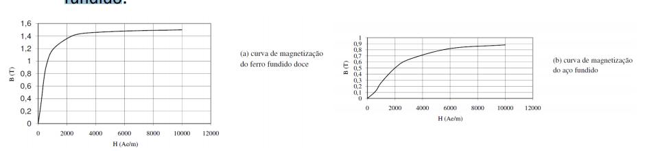 A forma como o núcleo magnético responde à variação do campo indutor depende do tipo de material utilizado e é representada graficamente através da “Curva de Magnetização”. As figuras abaixo mostram as curvas de magnetização do ferro fundido doce e do aço fundido.