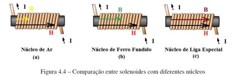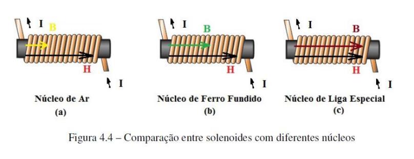 Assim se pode relacionar B, μ e H, considere que os seguintes solenoides possuem o mesmo formato, mesmo número de espiras, mesma corrente elétrica e mesmo comprimento.