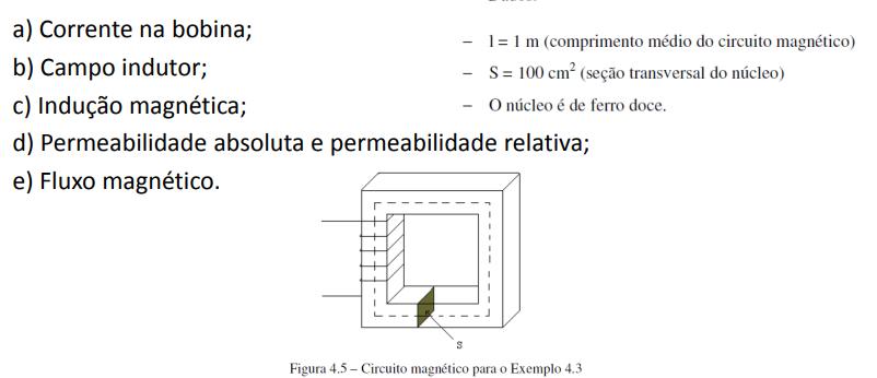 Exemplo 4.3: Uma fonte CC de 100V alimenta a bobina do circuito magnético da figura abaixo, que tem 1000 espiras e resistência de 100Ω.