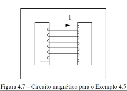 Exemplo 4.6: Uma fonte cc de 100V alimenta a bobina do circuito magnético da figura abaixo, que tem 1000 espiras e resistência de 100Ω.