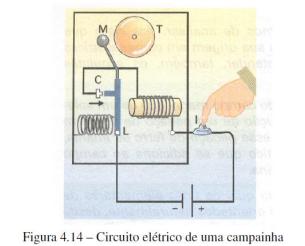 Na figura abaixo, está representado o circuito elétrico de uma campainha elétrica muito simples: L é uma lâmina de ferro flexível, e C é um contato que abre e fecha o circuito quando a lâmina se afasta dele ou encosta nele. Quando o circuito é fechado pelo interruptor I, a corrente no eletroímã faz com que L seja atraída, e o martelo M golpeie o tímpano T.