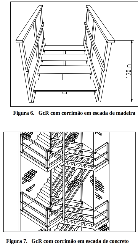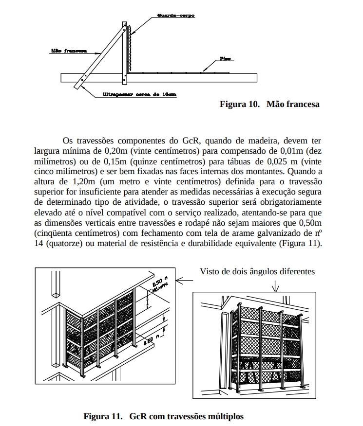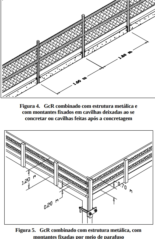 Esses dispositivos de proteção são de instalação obrigatória em todos os níveis das edificação a serem servidos por elevadores. Toda periferia da construção deve ser dotada de dispositivos de proteção contra quedas desde o início dos serviços de concretagem da primeira laje. Um meio tecnicamente recomendado para a viabilização dessa proteção periférica é se prever, desde a colocação das formas de lajes e pilares inferiores, suportes de fixação para montantes de sistema de guarda-corpo e rodapé a ser instalado no piso de trabalho superior (Figuras 1, 2, 3, 4 e 5). A proteção periférica provisória somente pode ser retirada para se executar a vedação definitiva de todo o perímetro do pavimento.