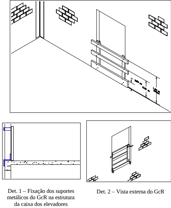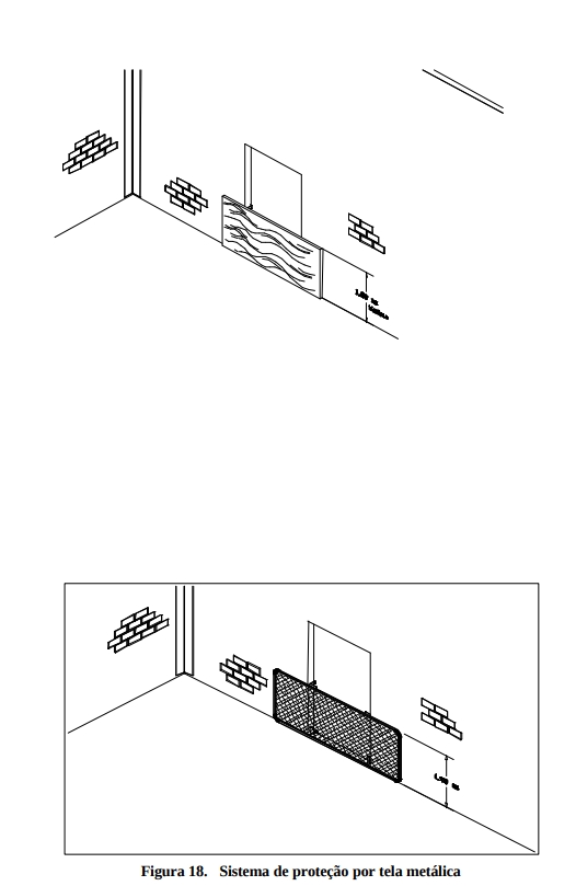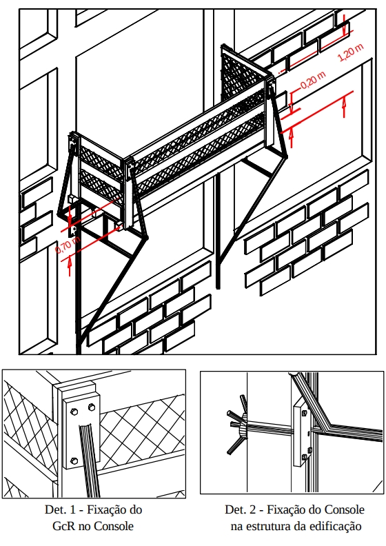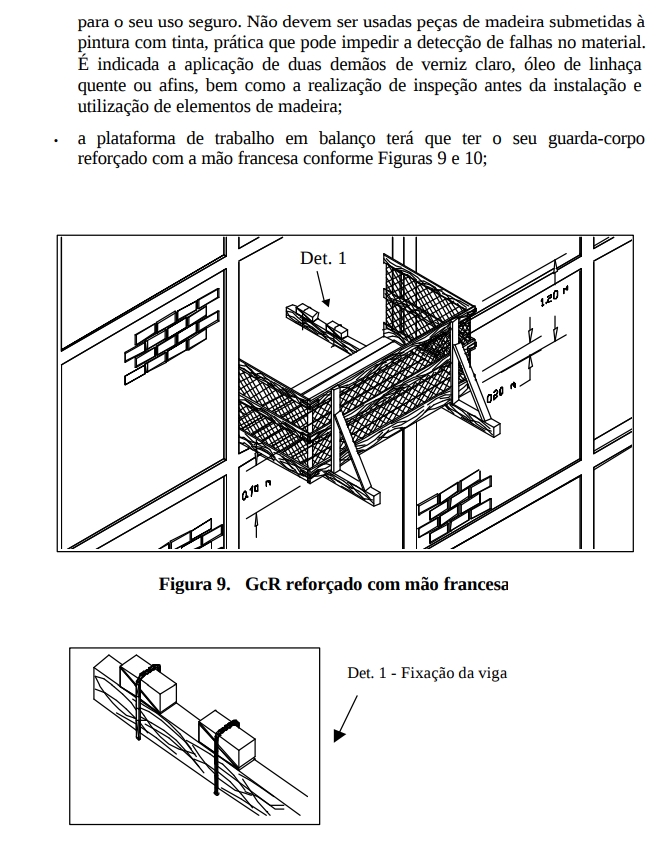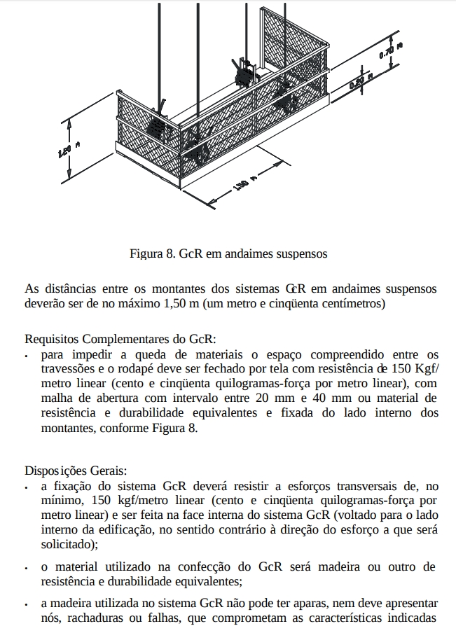 • A fixação do sistema é feita na estrutura definitiva do edifício em construção por meio de dispositivos que garantam resistência a esforços de impacto transversais de 150 kgf/metro linear (cento e cinqüenta quilogramas-força por metro linear).