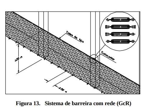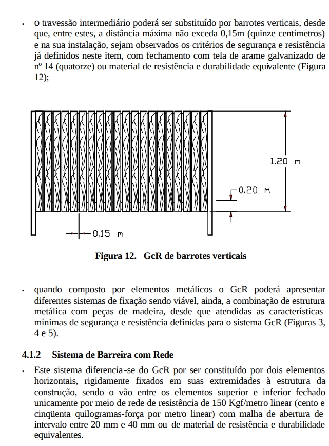 • Em qualquer ponto do sistema (elementos superior e inferior, tela ou rede e fixação) deve haver uma resistência mínima a esforços horizontais de 150 kgf (cento e cinqüenta quilogramas-força) (Figura 13).
