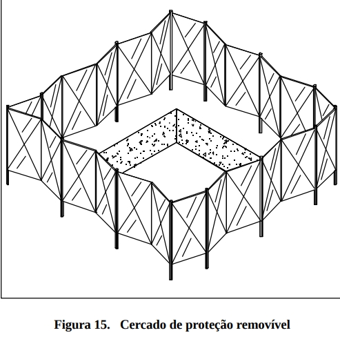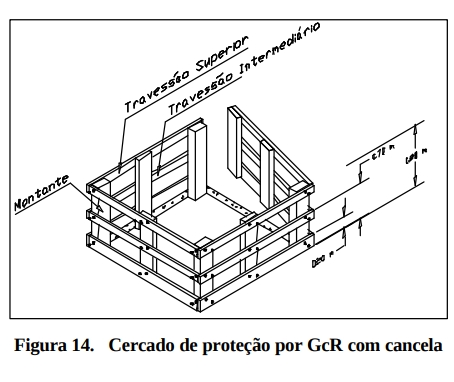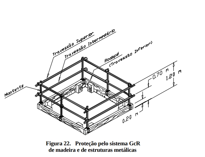 As aberturas no piso, mesmo quando utilizadas para o transporte de materiais e equipamentos, devem ser protegidas por cercado rígido composto de travessa intermediária, rodapé e montantes de características e sistema construtivo idêntico ao GcR. No ponto de entrada e saída de material o sistema de fechamento deve ser do tipo cancela ou similar (Figura 14)