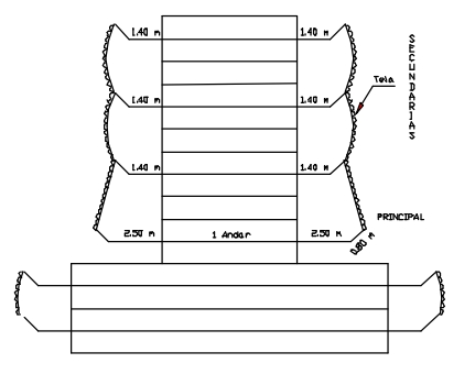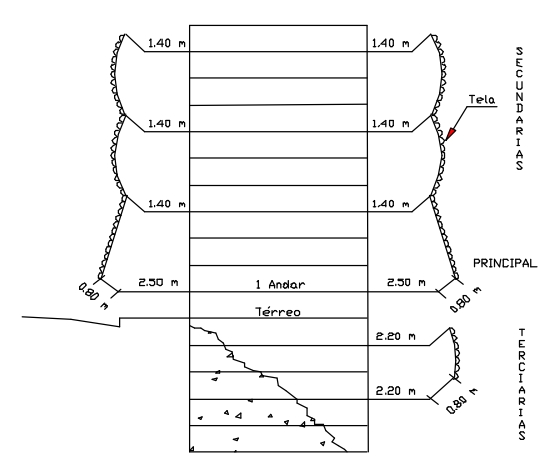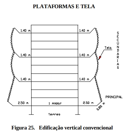 No corpo principal devem ser instaladas Plataformas Terciárias de Proteção na altura da primeira laje e quantas mais forem necessárias, de duas em duas lajes, a partir da primeira plataforma (Figura 26).