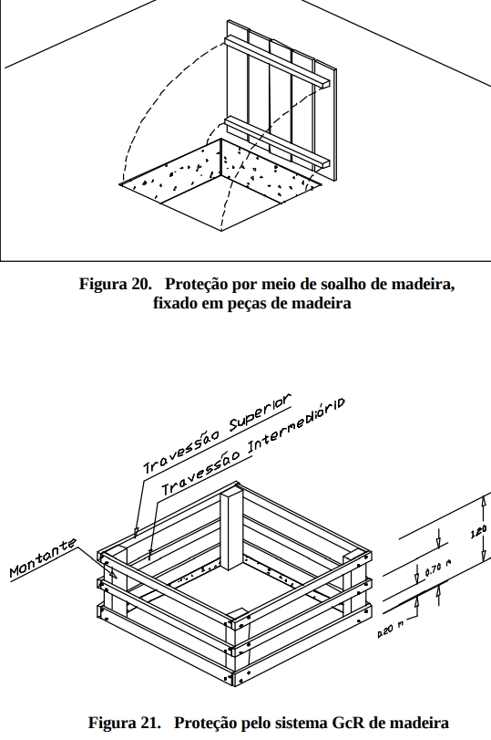 Todas as aberturas nas lajes ou pisos, não utilizadas para transporte vertical de materiais e equipamentos, devem ser dotadas de proteção sólida, na forma de fechamento provisório fixo (assoalho com encaixe), de maneira a evitar seu deslizamento ou por sistema GcR (Figuras 19, 20, 21 e 22).