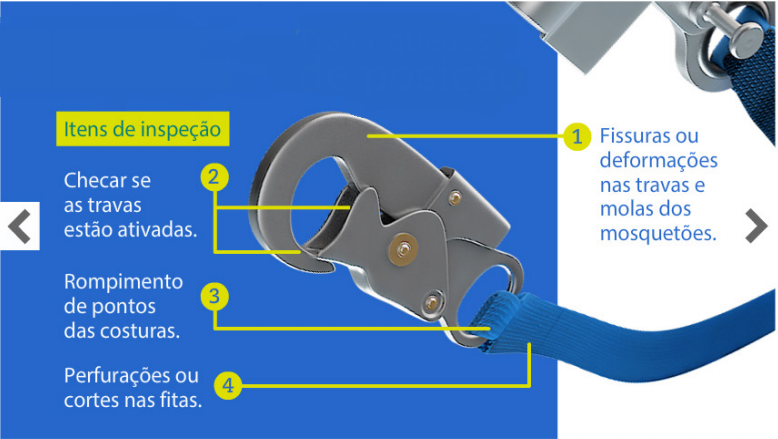 1.Fissuras ou deformações nos mosquetões (travas e molas).