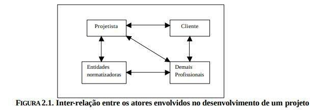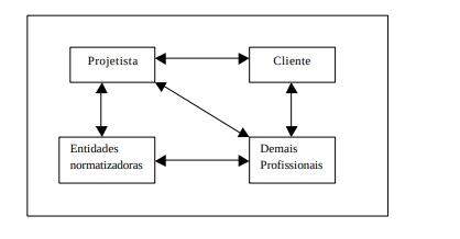 Não só atender às especificações delimitadas pelas normas técnicas e cliente, o projetista deverá estar inter-relacionado com os demais profissionais envolvidos na elaboração do conjunto de projetos. A inexistência desta interação pode complicar ainda mais a execução do seu projeto em especial. Esta interação entre os atores envolvidos na etapa de elaboração e definição do projeto, pode ser representado através da FIGURA 1.1. a seguir