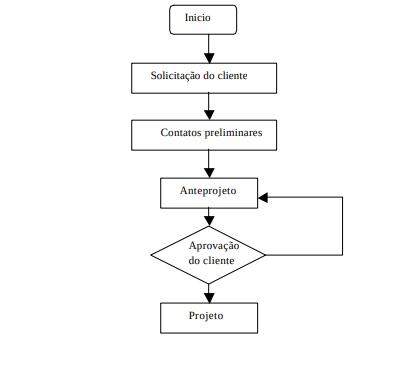 LIMA FILHO ( 1998 ) diz que o projeto dentre suas etapas, é o resultado de um estudo preliminar feito pelo projetista com base nas solicitações gerais do cliente e das condições locais, sendo representado através do fluxograma: