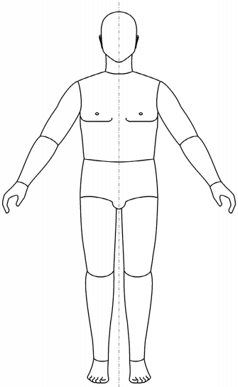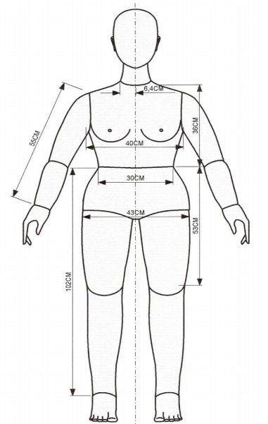 Como a grande maioria dos desenhos técnicos são construídos utilizando-se medidas de proporção da figura humana, construiu-se a figura humana planificada como mostra a figura n° 02, aqui mostra-se a figura de frente, mas também foi construída a figura de costa e lateral, como pode-se verificar nas imagens xerocadas, anexadas nesta pesquisa. A figura planificada é utilizada como suporte para os desenhos técnicos. Na construção da figura humana planificada utilizou-se medidas já existentes na ABNT para a área do vestuário, e outras medidas utilizadas para a modelagem das roupas.