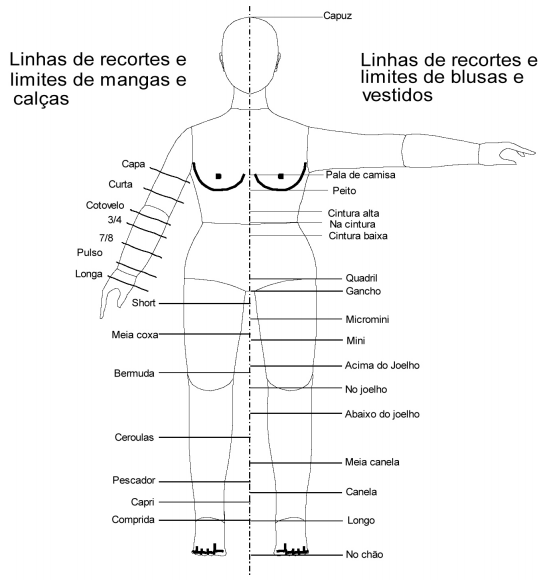 Constatou-se durante o estudo, que uma das dificuldades do aluno era visualizar as alturas específicas de cada peça de roupa em relação ao corpo para representa-las graficamente. Assim, utilizando-se a figura humana planificada, elaborou-se linhas limítrofes de todas as peças desde calças e vestidos, até limites de mangas curtas e longas. Dessa forma, a utilização do desenho técnico explicitando cortes, modelagem e execução, é completo e detalhado, com descrição da forma e do tamanho de cada peça. Para esta construção gráfica, foi utilizada medida de várias peças de roupa e transferidas para a figura planificada. Para esta transferência os pesquisadores preocuparam-se em aplicar a padronização somente quando não existiam normas já consagradas da ABNT, o resultado pode ser visto na figura abaixo.