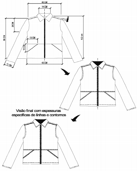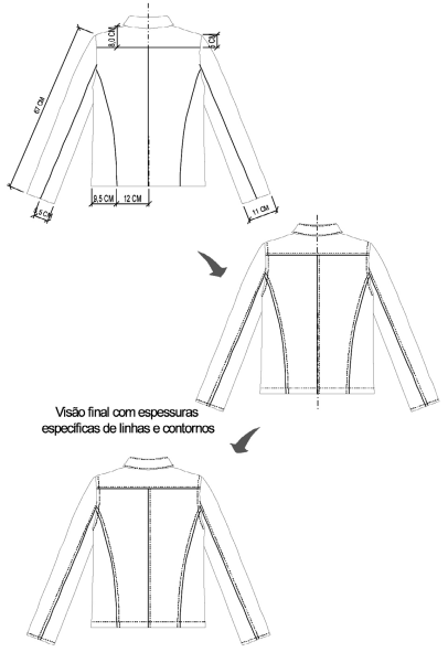 Com os suportes já elaborados, iniciou-se a aplicação dos padrões de construção na representação gráfica de peças do vestuário. Partiu-se do ensino e aprendizagem da simetria, utilização dos suportes, padrões, linhas e cotas, nesse caso, quando tivesse o protótipo pronto. Representou-se graficamente o passo a passo de várias peças, como se pode ver no exemplo da figura n° 06 no modelo de uma jaqueta de frente, e de costas figura n° 07. Em ambos os casos utilizou-se o suporte da figura humana planificada, e como havia o protótipo pronto, trabalhou-se com as medidas de cotagem.