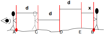 Com a baliza em C fixa, este será o novo operador de RÉ, e quem estava em A vai para o ponto D, alinha-se novamente CDB e confere a medida d, e assim sucessivamente. A medida x será o que faltar até chegar no ponto B, sendo, portanto, menor que d.