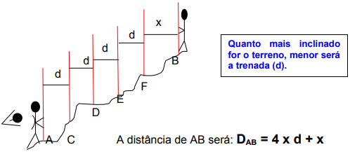 Em terrenos suaves, para se medir um alinhamento procede-se conforme a seguir. Seja um alinhamento AB.