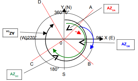 Todo alinhamento em topografia deve ser orientado, e uma das formas é em relação a direção Norte. Esta orientação se dá através de um ângulo entre esta direção e a do alinhamento. Para melhor entendimento do assunto devemos estudar o Círculo topográfico.
