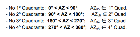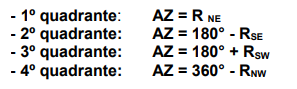 Estas são as quatro equações de transformação de Azimute em Rumo e viceversa. Ou seja, se conhecermos o Rumo calculamos o Azimute, ou se conhecermos o azimute calculamos o rumo.