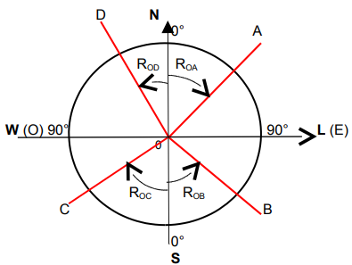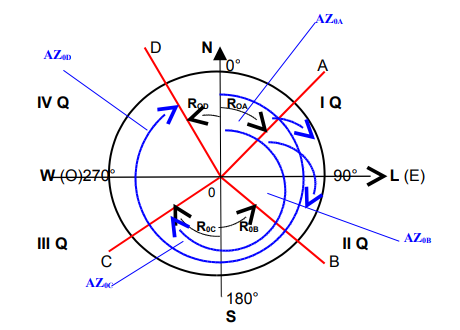 Observe-se, também, que os rumos 0A (NE) e 0C (SW), são no sentido horário. E os rumos 0B (SE) e 0D (NW), são no sentido anti-horário.