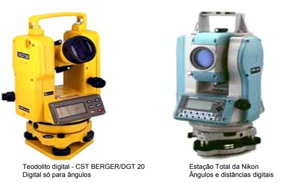 d) Eletrônicos: Decorrentes do grande avanço tecnológico na área de informática e eletrônica. Os ângulos são lidos diretamente em visor com disoplay de cristal líquido (LCD), leitura digital. Funciona à bateria ou pilhas. Pode ser usado em todo o tipo de relevo e oferece ótimas precisões. Estes instrumentos podem medir ângulos digitalmente ou ângulos e distâncias digitalmente. Quando estes vêm com um equipamento internamente que mede eletronicamente distâncias entre pontos – Distanciômetro, recebem o nome de estação total.