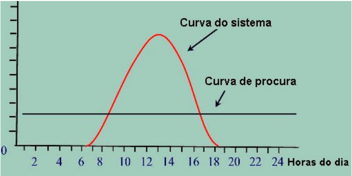 Normalmente o banco de baterias de acumuladores e os módulos fotovoltaicos trabalham em conjunto para alimentar as cargas. A fig. 22 a seguir mostra como se distribui a entrega de energia à carga ao longo do dia. Durante a noite toda a energia pedida pela carga é fornecida pelo banco de baterias.