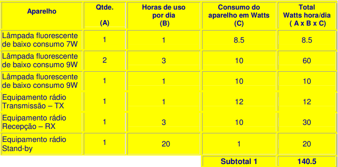 1) Identificar cada carga de corrente contínua, seu consumo em Watts e a quantidade de horas por dia que deve operar. No exemplo consideraram-se lâmpadas de baixo consumo de 7 e 9 W que, com os seus reatores, consomem respectivamente 8,5 e 10 W. Considerou-se também um equipamento de rádio onde se identificou seu consumo em transmissão e recepção e também em stand-by.
