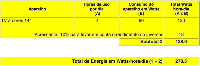 3) Somar os Watts hora/dia de cada aparelho para obter os Watts hora/dia totais das cargas em corrente contínua (Subtotal 1).
