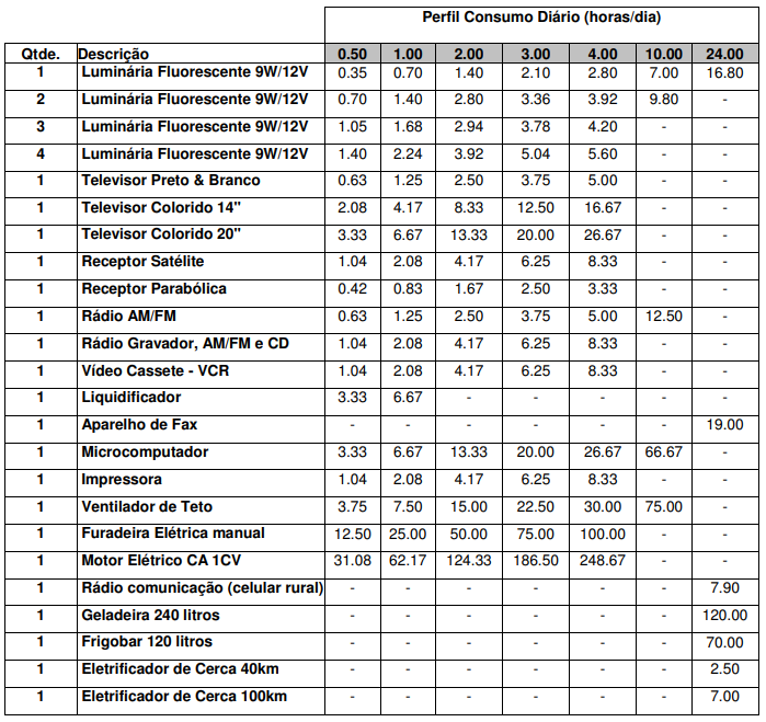 Segue a seguir uma tabela para auxilar no cálculo do consumo em Ah de diversos tipos de equipamentos comumente utilizados em sistemas fotovoltaicos em vários regimes de operação: